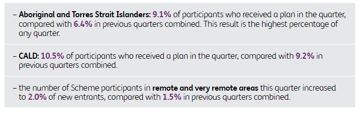 Participant diversity continues with higher proportions of Aboriginal and Torres Strait Island and Culturally and Linguistically Diverse (CALD) Scheme entrants this quarter.